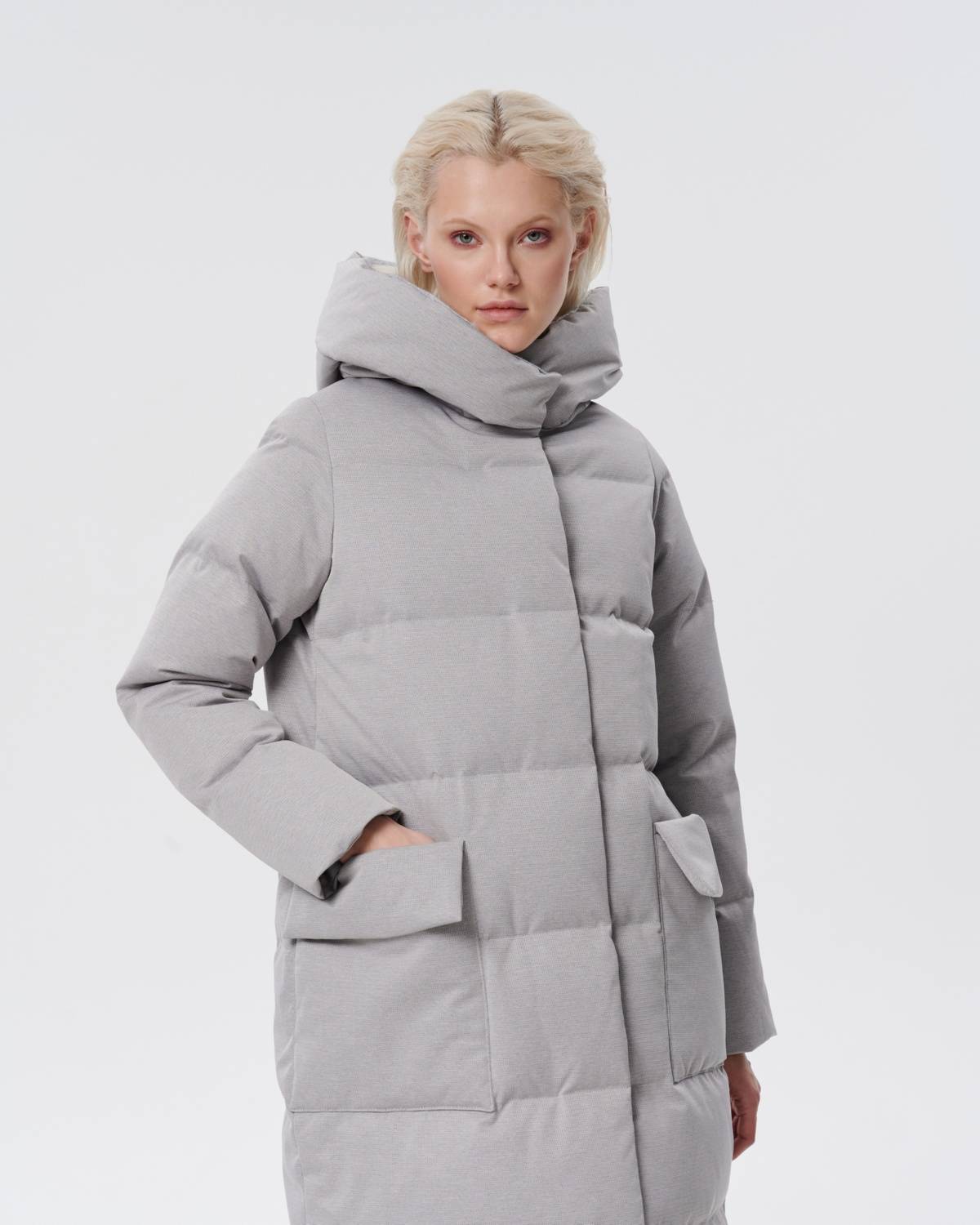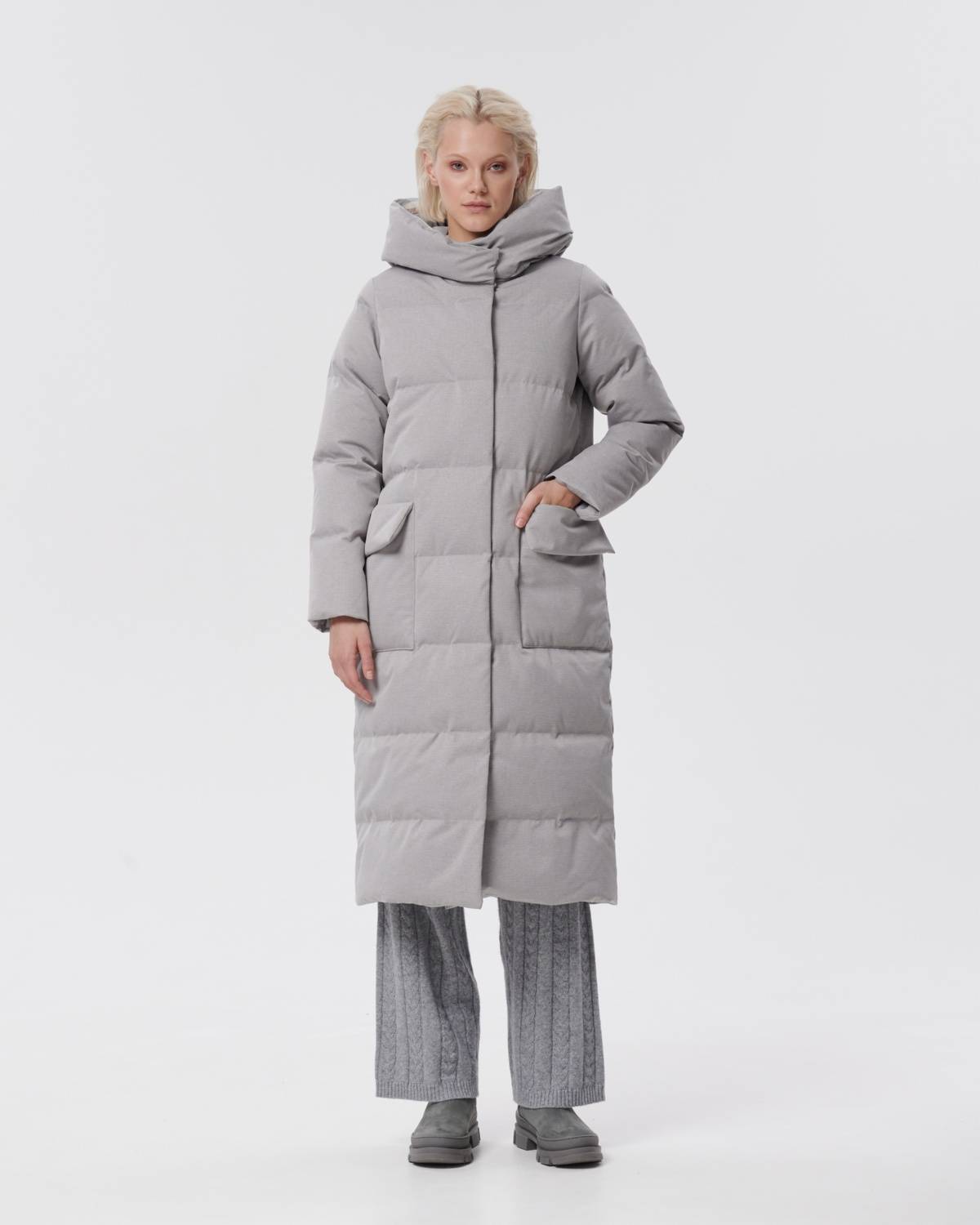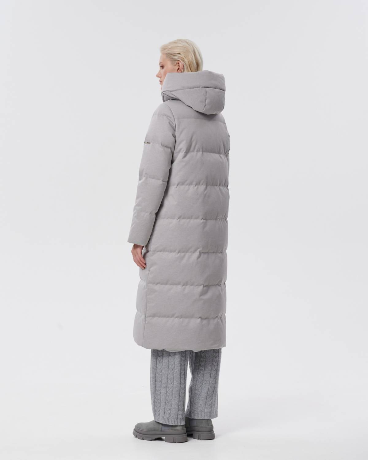 пуховое пальто из фактурной серой ткани