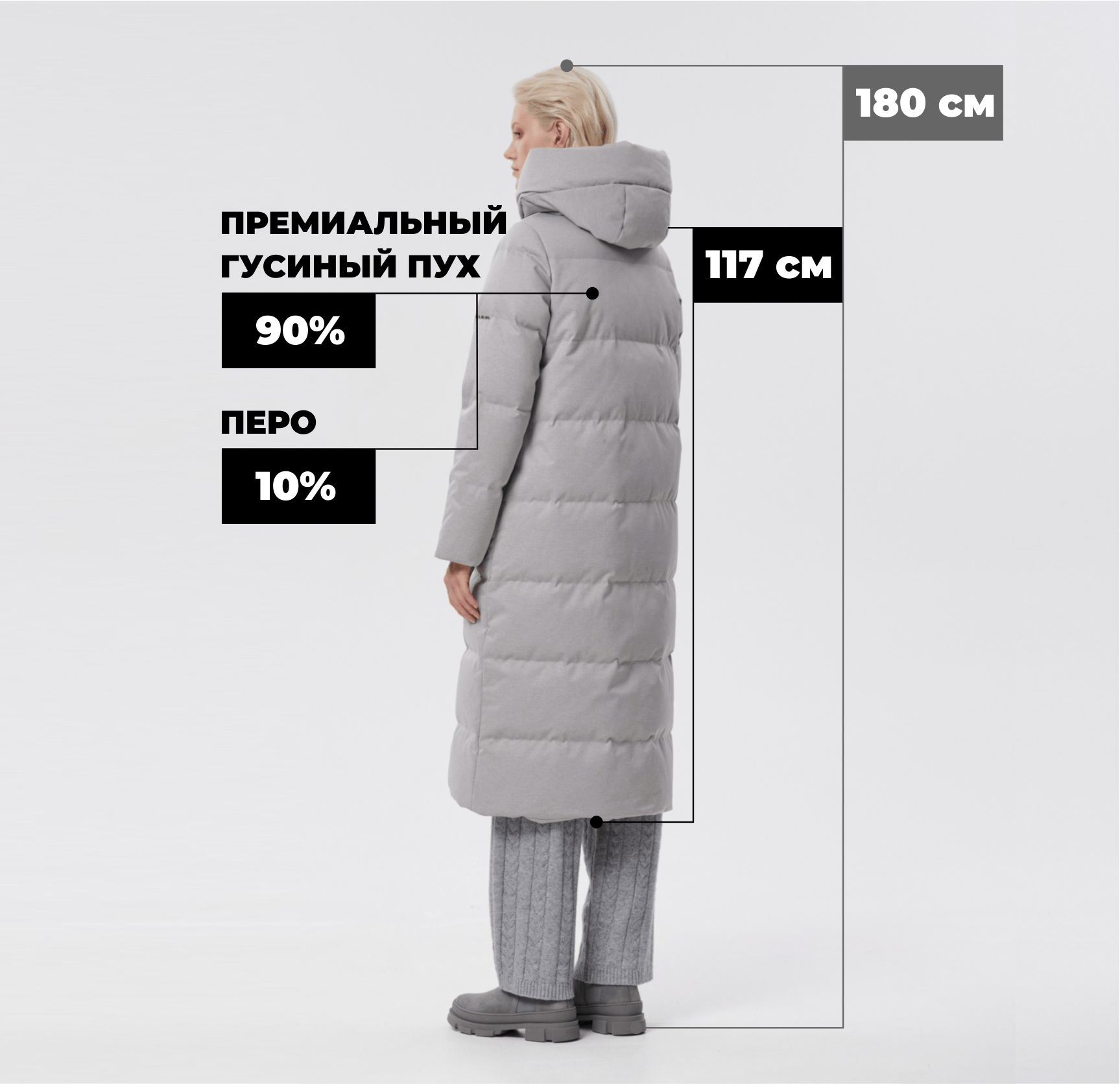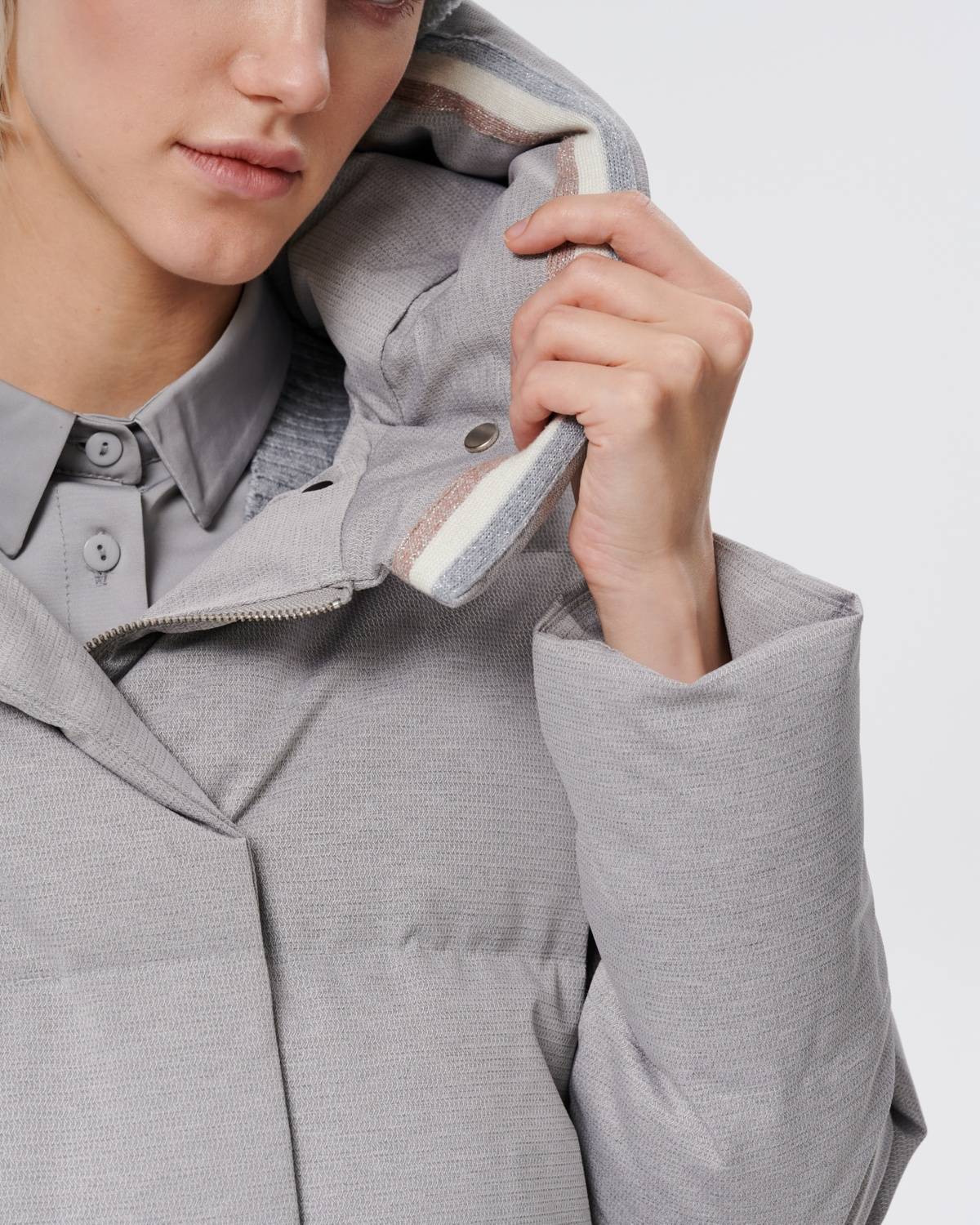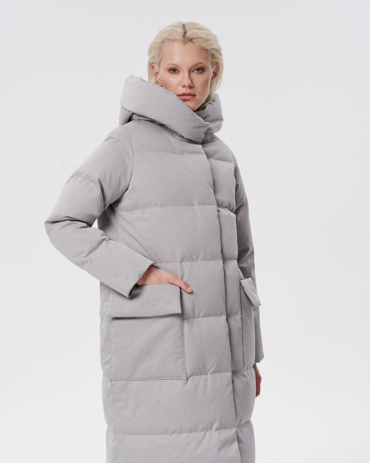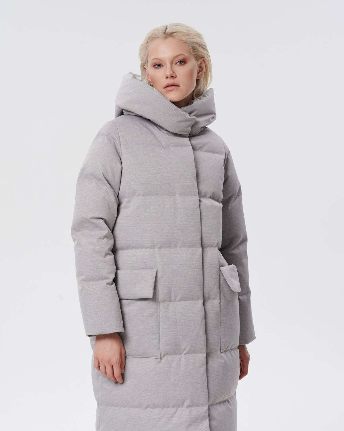пуховое пальто из фактурной серой ткани